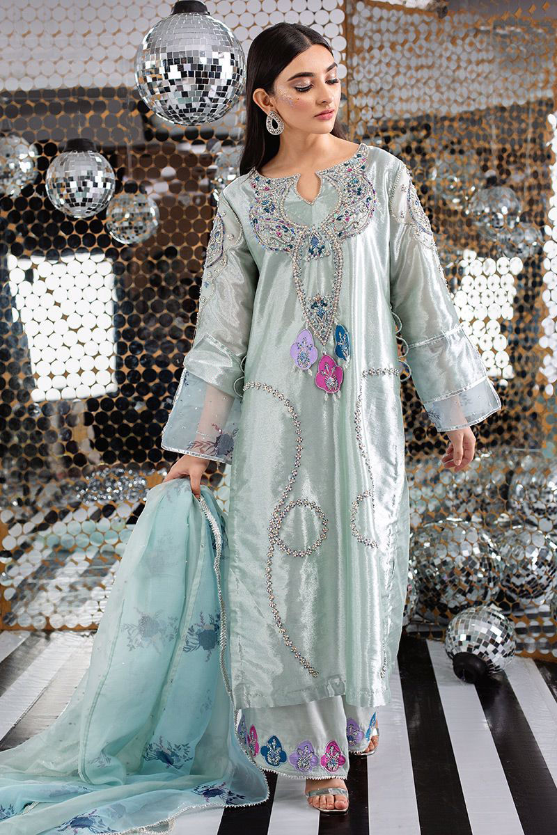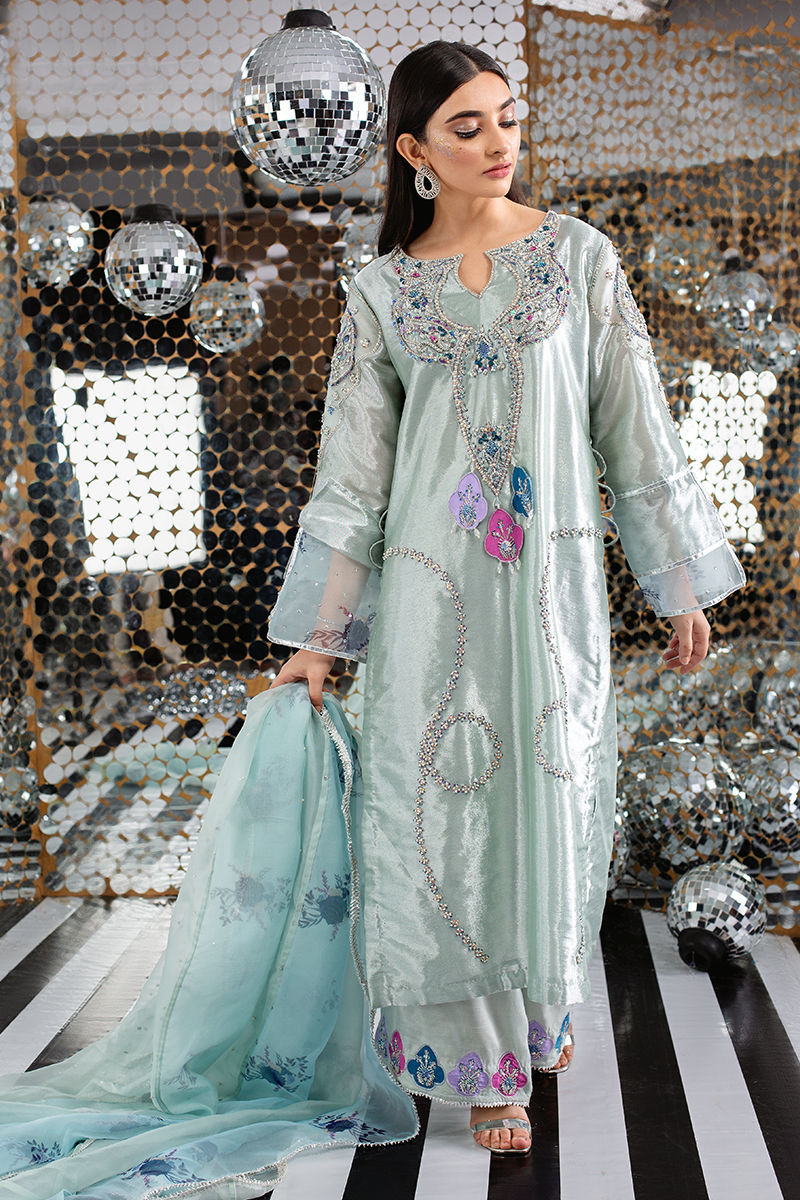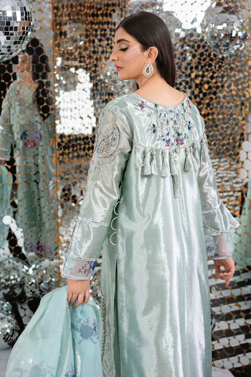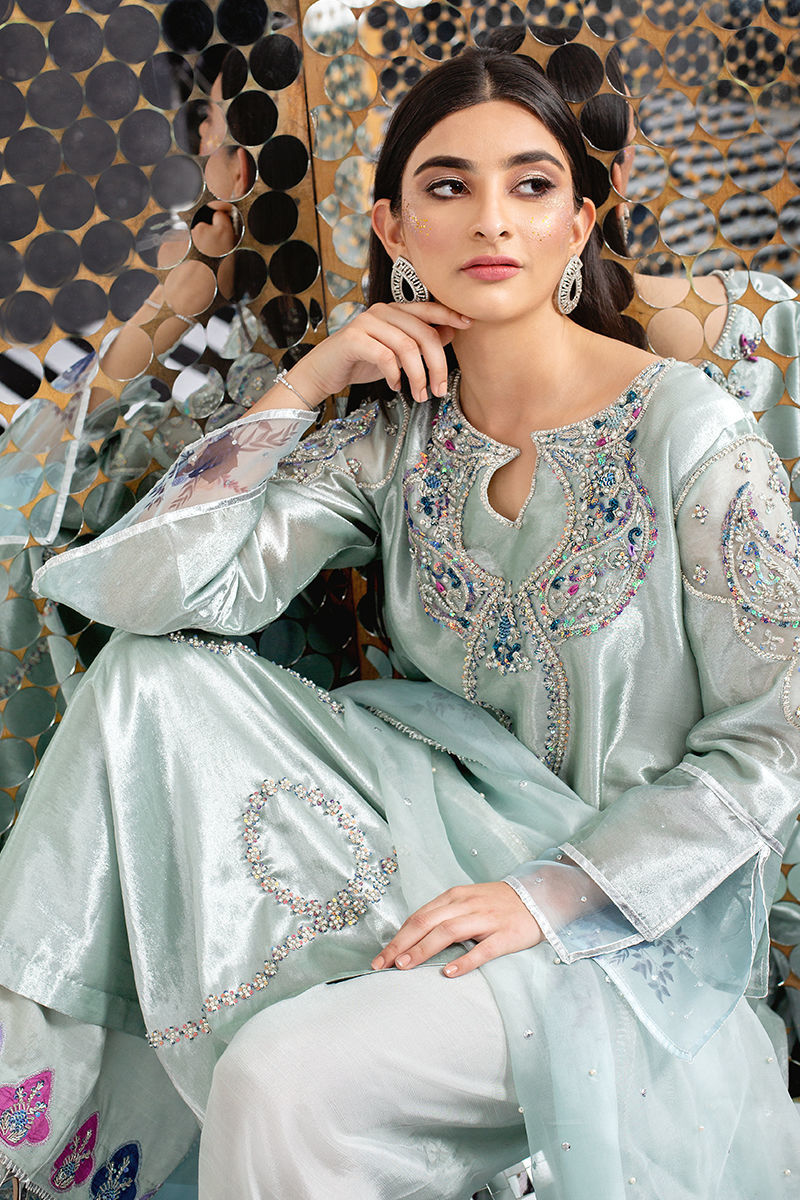 This collection we have played around with age old sequins and embroidery techniques encrypting into modern hues. A perfect ice blue toned tissue encrusted with unicorn toned sequins hand work and French knot detailing. The tassel and handwork detailing at the back makes it so chic. It is paired with an organza seafoam dupatta with swirled statement frills with our in house digital prints with embroidery and lace detailing. Shirt: Organza Dupatta: Organza Pant: Organza