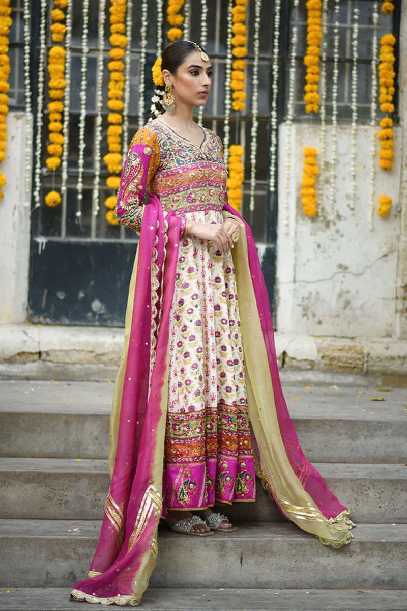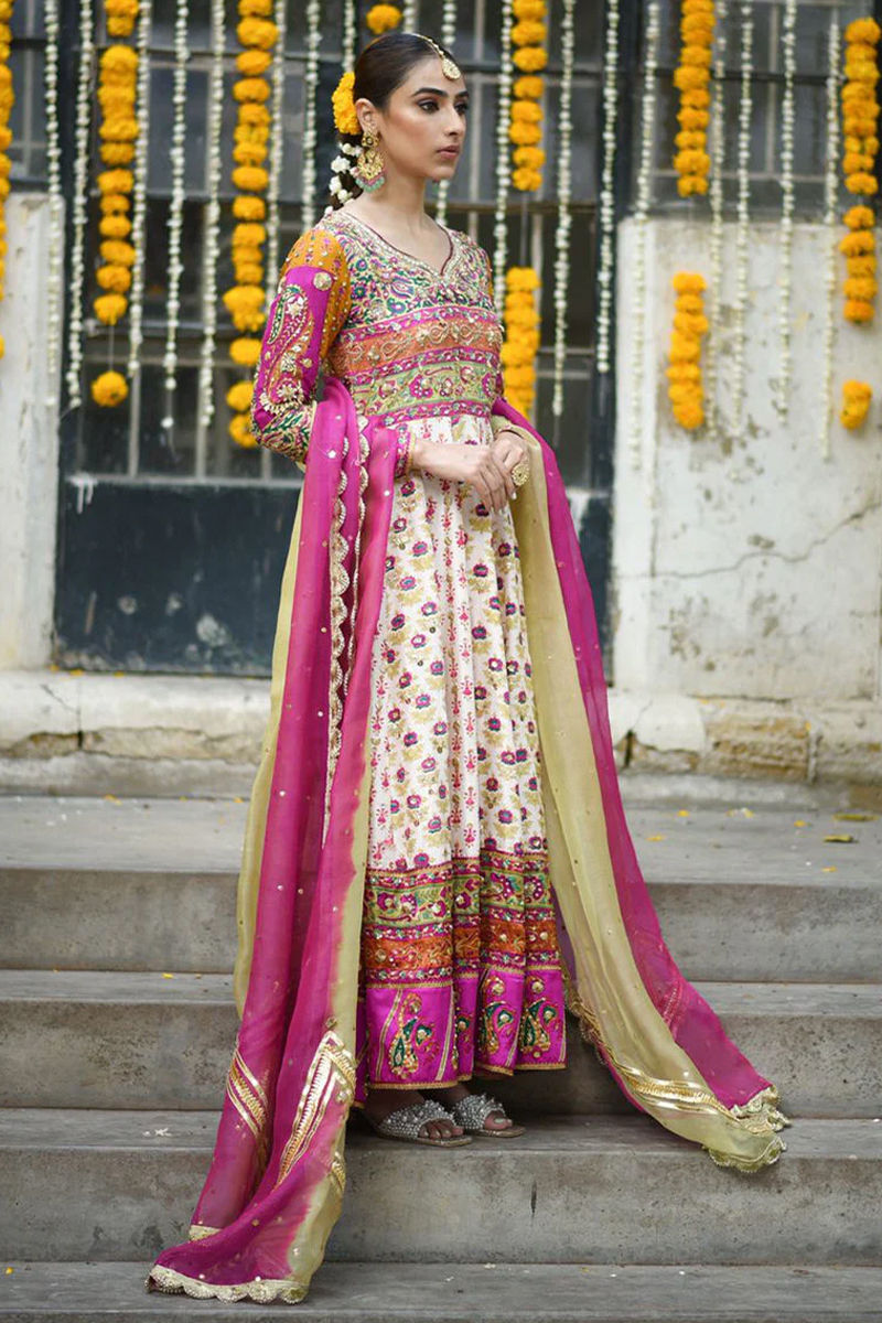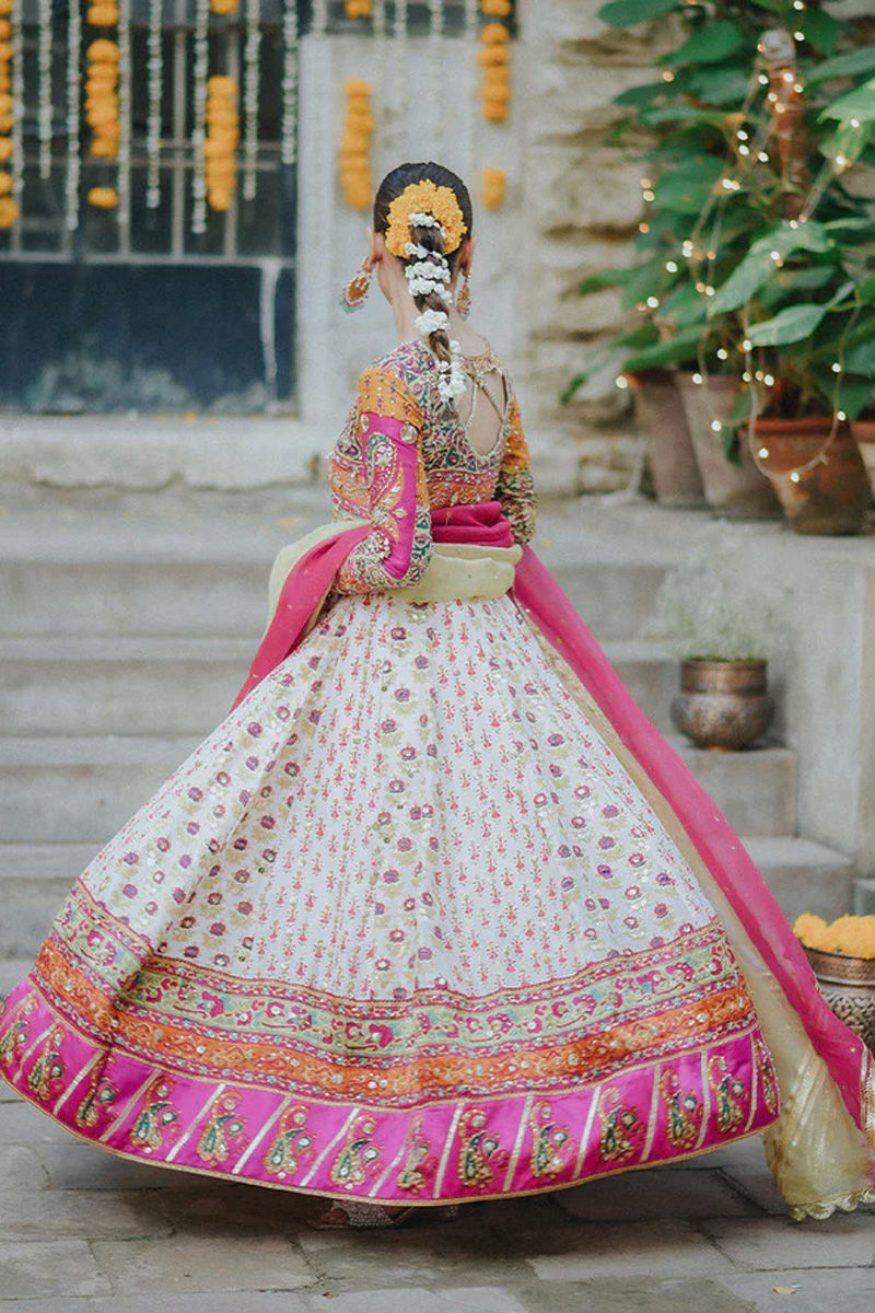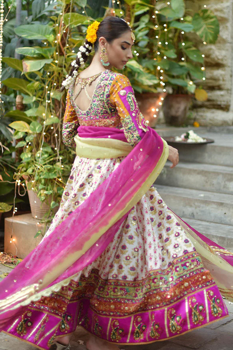 An absolute show stopper! This has to be our Favourite for the season! We share a bias towards it because of the burst of colours! It is a full on Festive Dhamal outfit just perfect for a shendi or mehndi! An absolute show stopper. The lubna kalidar is designed to give a slender waistline an extra flaring kalis for that unforgettable twist and stunning silhouette. Wear it as a modern-day fairy-tale bride that makes you feel like a timeless princess. It is fully hand printed on pure raw silk in tones of pink, orange, mustard, saffron and green. The bodice is fully hand worked with zardozi kora dabka gotta kundan to make you dazzle on your special day. The show stopping back with intricate hand work and cut out details is enough to raise temperatures! Kalidar is fully sprayed with handwork and the pure charmeuse silk borders are also ladened with work and colour! We have paired it up with fuscia pink and kiwi green organza Duppata with gotta details and scallops ladened with chan. You may add a lengha and potli pouch. Shirt: Raw Silk Dupatta: Raw Silk