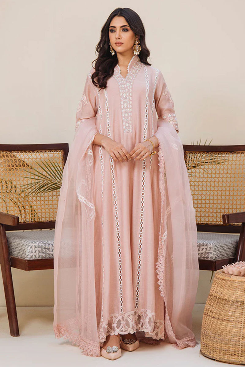 Grace with subtlety. The quintessential staple this Eid/ Ramadan. A luxurious kora cotton pink panel long shirt with pretty lace details on the panels. The high collar and neckline are fully embroidered with subtle tones of pink and off-white and sequence details. The folded embroidered cuffed elbow sleeves give that edge to the shirt with our signature handmade lotus flower and mirror tassels on high-side slits. The shirt is finished off with our in-house appliquéd embroidery on daman. Organza dupatta is an amalgamation of laces and pleats. You can pair it up with pants to offset the grand look.