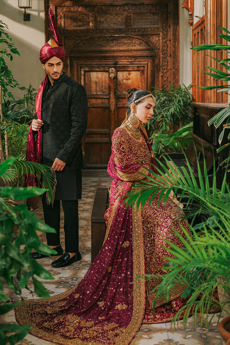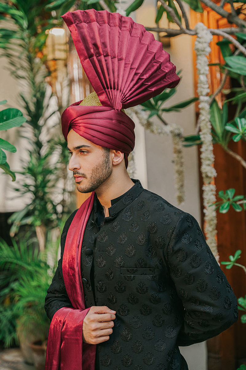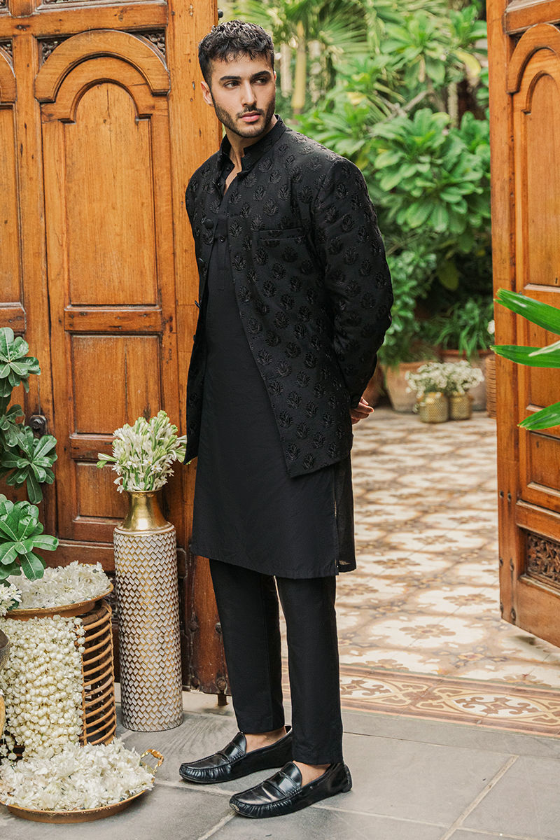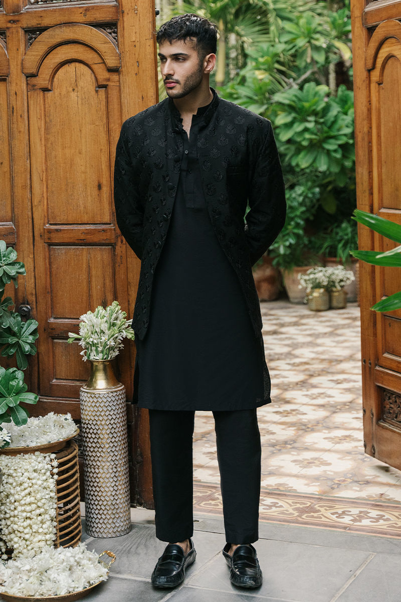 This sophisticated black prince coat is a quintessential piece of elegance and style. Crafted from luxurious fabric, the coat features intricate embroidery that adds a touch of opulence and refinement. The buttons add a functional and decorative element, enhancing the overall design and structure of the coat. Beneath the prince coat, the outfit has a solid kurta and pajama set. The kurta is crafted from a high-quality fabric that complements the richness of the black prince coat. Its simple, solid color ensures that the focus remains on the embroidered coat while providing a refined and classic look.