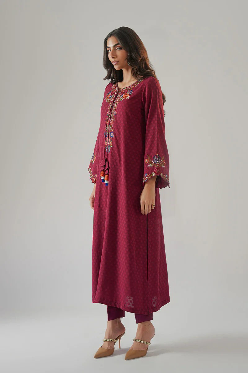This elegant maroon long kurta is crafted from a breathable fabric, ensuring both comfort and style throughout the day. The rich, deep maroon color gives the kurta a timeless, regal appeal, perfect for both formal and semi-formal occasions. The fabric is soft and airy, offering ease of movement while keeping you cool and comfortable, making it ideal for warmer climates or longer events. Adorning the kurta, are the beautiful Hungarian floral motives inticrately embroidered. Silk Pants are an add on. Model height: 5'10. Maximum shirt length: 52"
