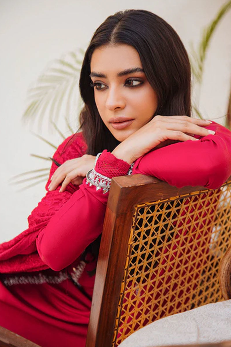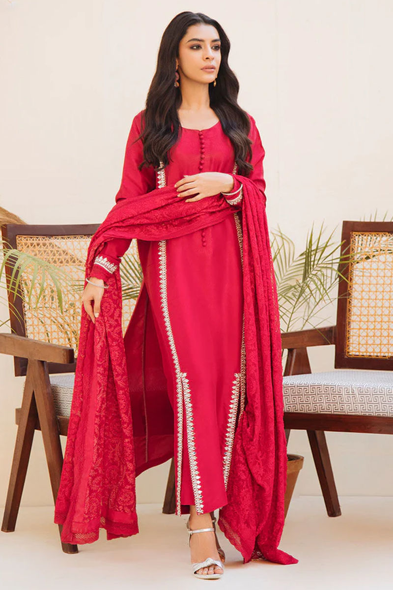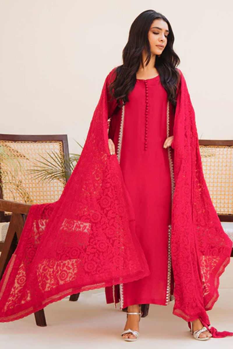 Make heads turn with this striking red pure raw silk shirt with hand-worked (mirror, kora dabka, crystals, and French knots) details on the panel, slits, and sleeves with classic French knot buttons on the neckline. We love all embroidered schiffli dupatta creating a monotone look. Paired with pants in plain raw silk.Shirt: Raw SilkPant: Raw Silk