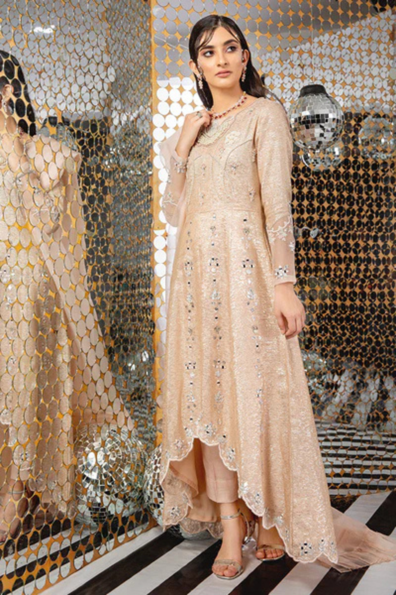 A chic hi-low flattering silhouette in blush pink shimmer fabric. The outfit is encrusted with hand work pearls crystals and gota. The sleeves are detailed with embroidery. Complete the look with our organza ruffled dupatta and signature pants.