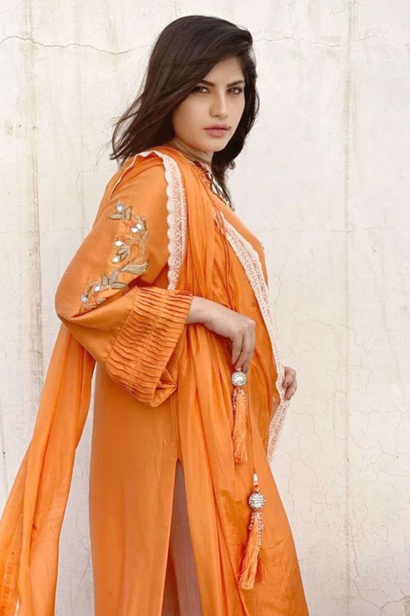 Flattering straight line Raw silk shirt in a bright orange tone. The hem and neckline has embroidered details and the sleeves with hand work details and pleats. It comes with a tissue silk dupatta with lace detailing. Complete the look with our signature off white pants with lace.*Color can be Customized.Shirt: Raw SilkDupatta: Raw Silk