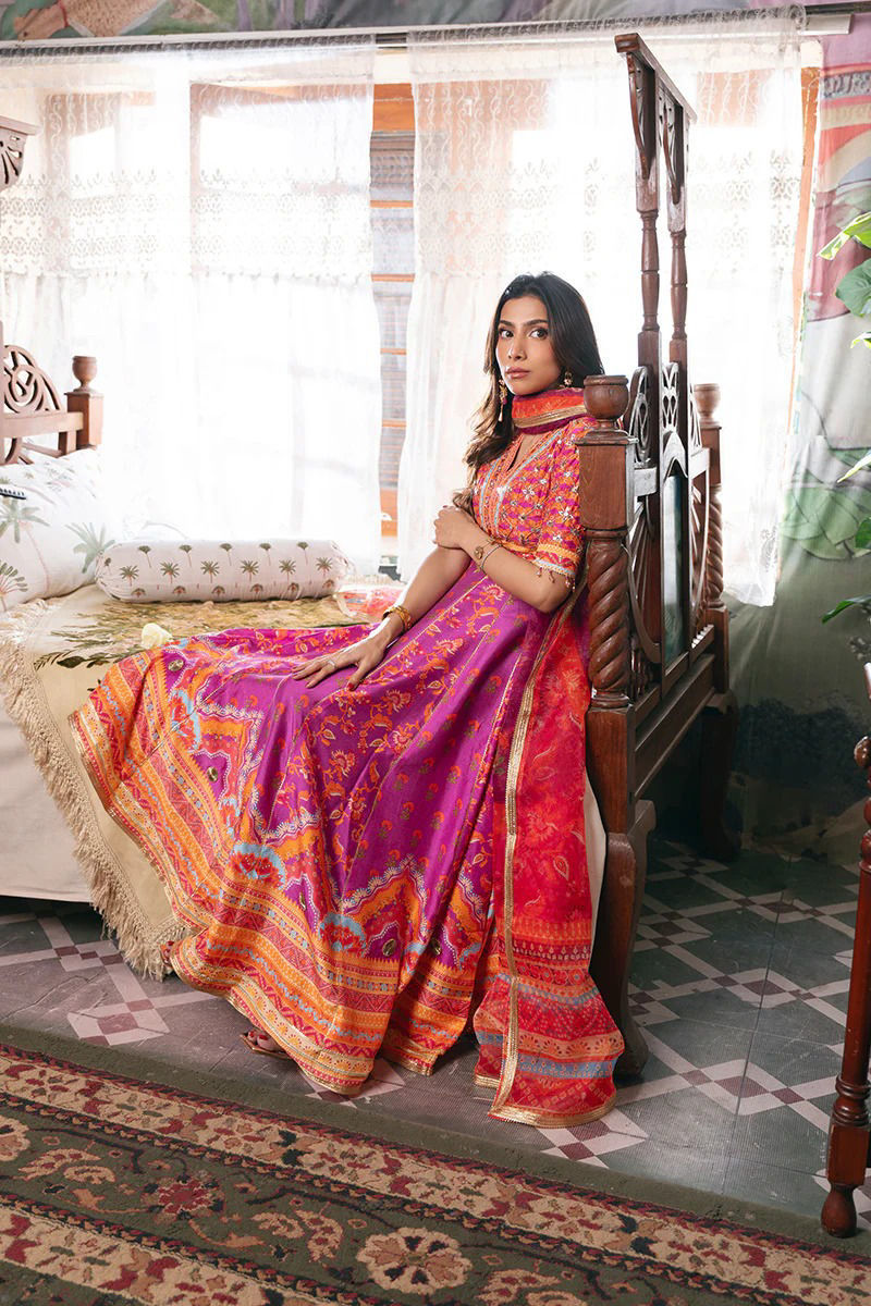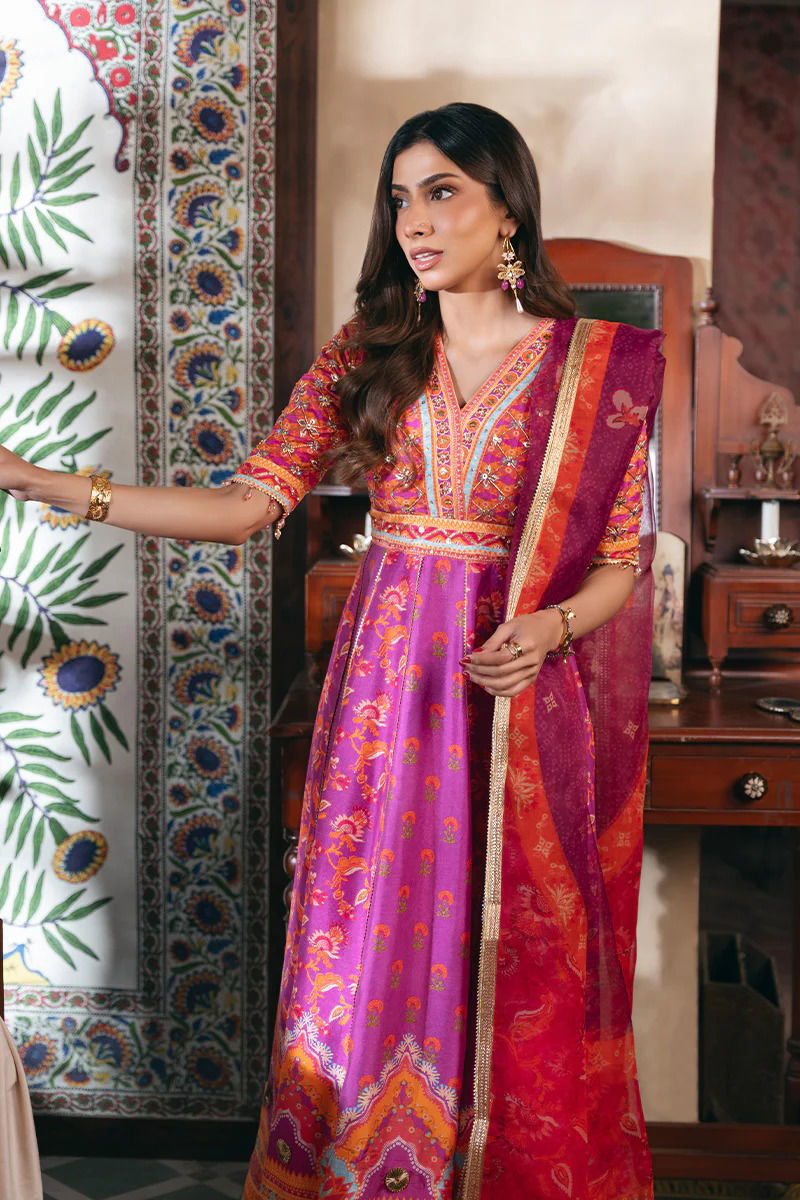 Crafted from luxurious printed fabric, this purple peshwas is a celebration of elegance and intricate artistry. Adorned with exquisite handwork of gota, resham, dabka, stones, and sequins, the detailed embellishments on the bodice and hemline bring a regal charm to the flowing silhouette. The rich hues make it a standout choice for festive occasions.Completing the ensemble is a beautifully printed organza dupatta, delicately finished to enhance the overall elegance of the look. Paired with tailored pants. Designed for year-round wear, to create a look that radiates grace and sophistication at every event!