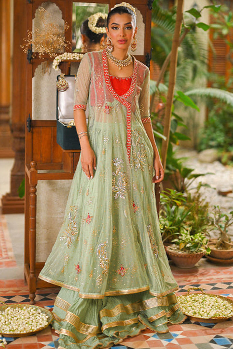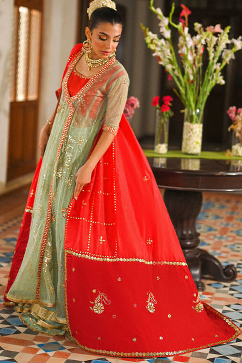 The mint green kalidar angrakha is a sight to behold, adorned with handcrafted age-old kaamdani bunches that exude elegance. Intricate kora, dabka, and resham bootis, sprinkled with sequins, add a touch of opulence. The burnt orange choli creates a striking contrast and leaves a lasting impact. The dramatic back, embellished with appliqués, kamdani, and kora dabka bootis, adds an element of allure. Completing the look is a super stunning two-toned kattan silk dupatta, featuring a heritage pattern of kamdani and Gota bunches. This ensemble is the perfect choice for a mehndi bridal outfit, encapsulating tradition and modernity in one breathtaking ensemble. * Colour can be Customized