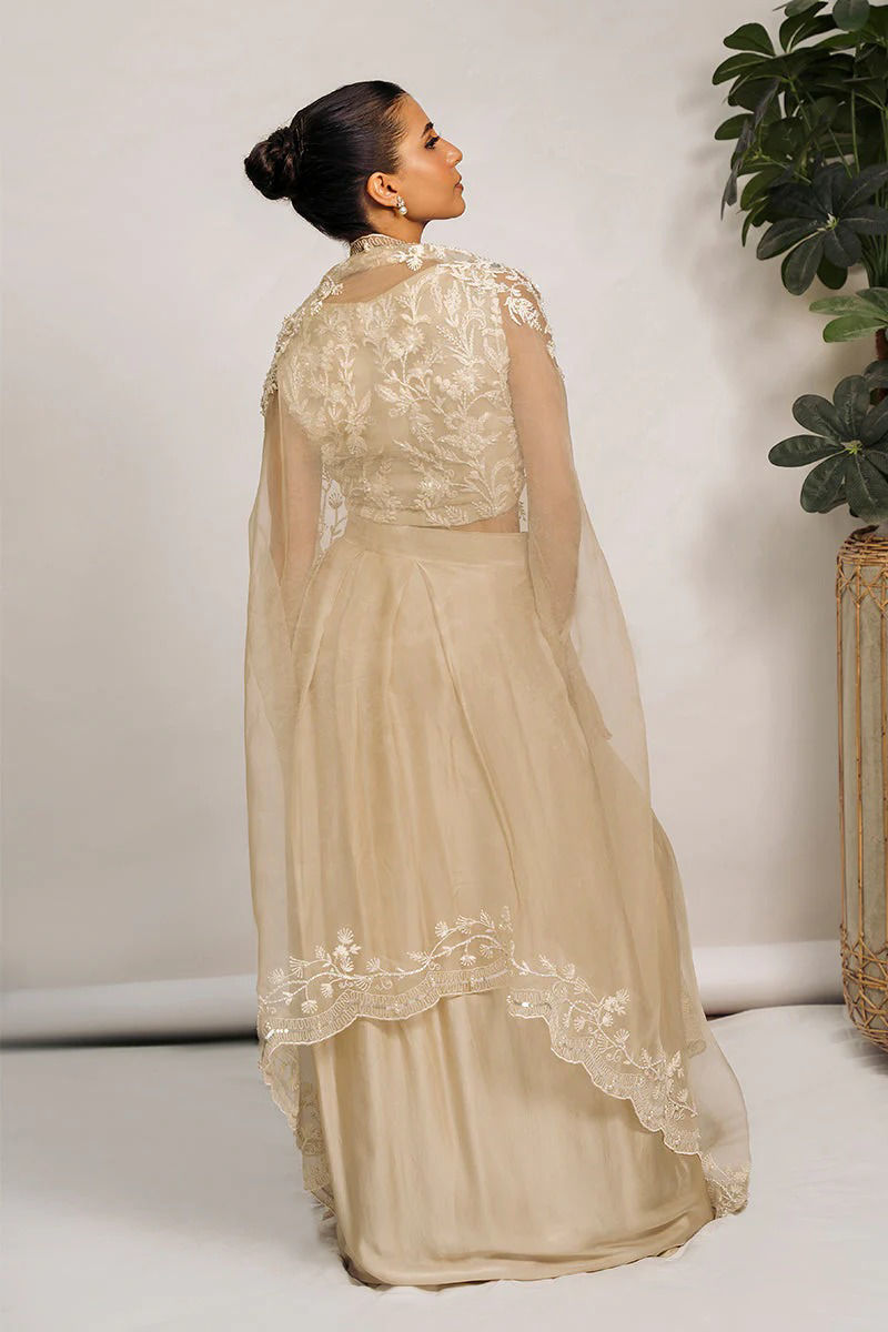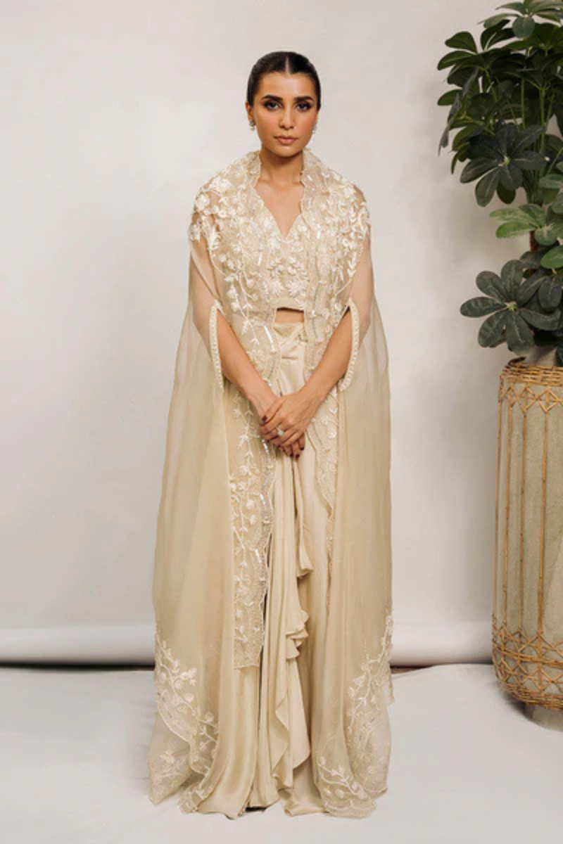 we are in love with this vanilla shade. Understated yet fully worked ( thread-work, sequence, Cutdana) organza cape jacket. Scalloped neckline choli catches the attention with its intricate worked anchor and hand worked jaal. Dhoti skirt in bengali chemeuse gives a modern twist to the whole look. Wedding brunches and soirées just got sorted.