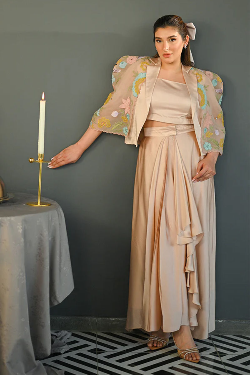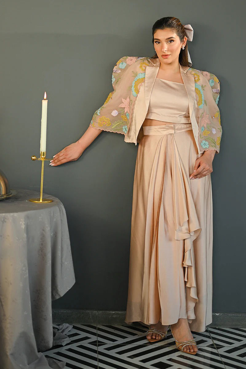 This stunning ensemble features a delicate organza jacket, intricately embroidered with soft pastel floral appliques that bring a touch of natures beauty to life. The jacket is adorned with mirror detailing, adding a subtle shimmer that catches the light with every movement. Paired with a luxurious satin silk slip, the outfit exudes elegance and grace, while the dhoti pant drapes effortlessly, its smooth satin silk fabric enhancing the outfit's sophisticated flow. Dhoti pants are an add on. Jacket length 20 ,14 inch blouseModel height : 5’5