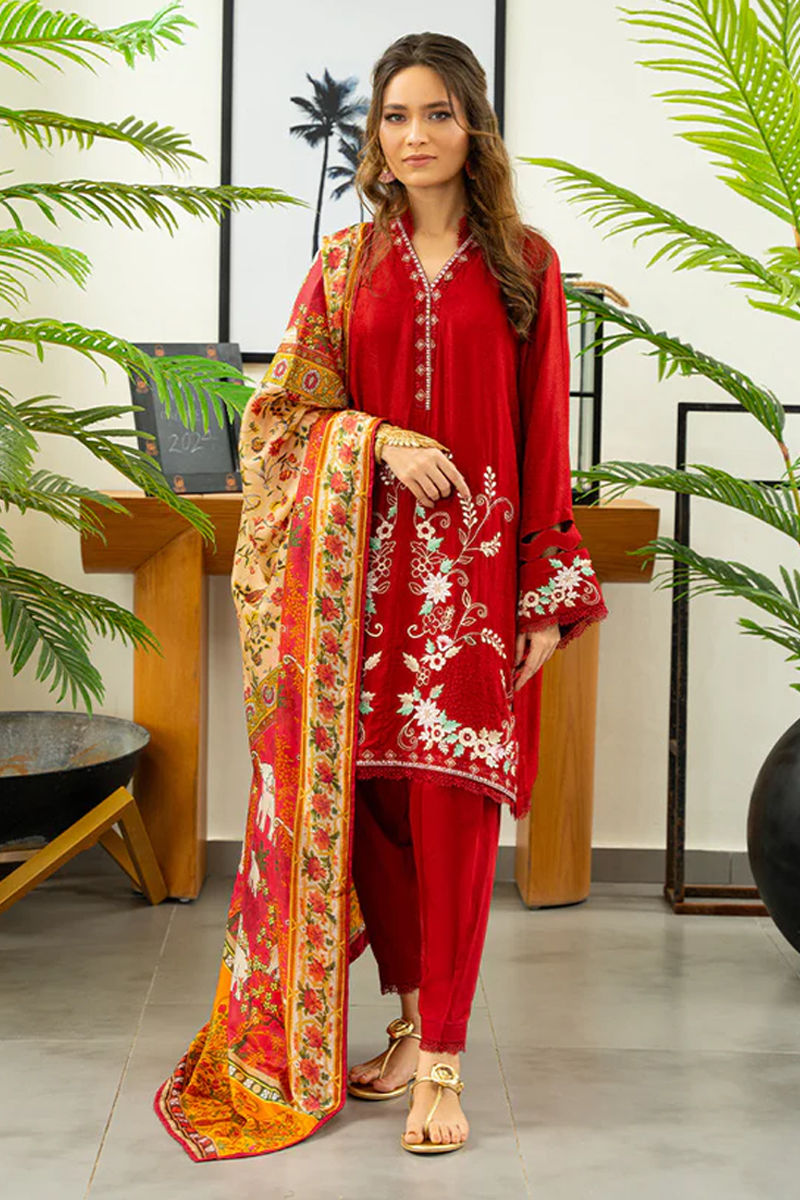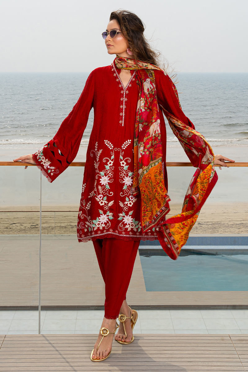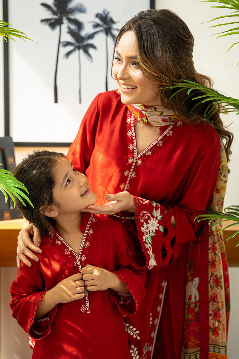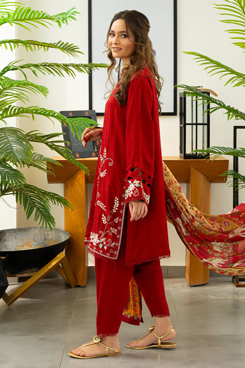 Deep cherry red inhouse embosed silk short shirt catches our eye. stunning embroideries on daaman, chaak, sleeves and neckline with amalgamation of zari. laces detailing and cutwork on sleeves brings out the whole ensemble. skinny shalwar is on silk. our curated printed dupatta with mughal floral prints in complementing colours is a true stellar.Shirt: In-House Embossed SilkDupatta: Medium SilkShalwar: In-House Embossed Silk