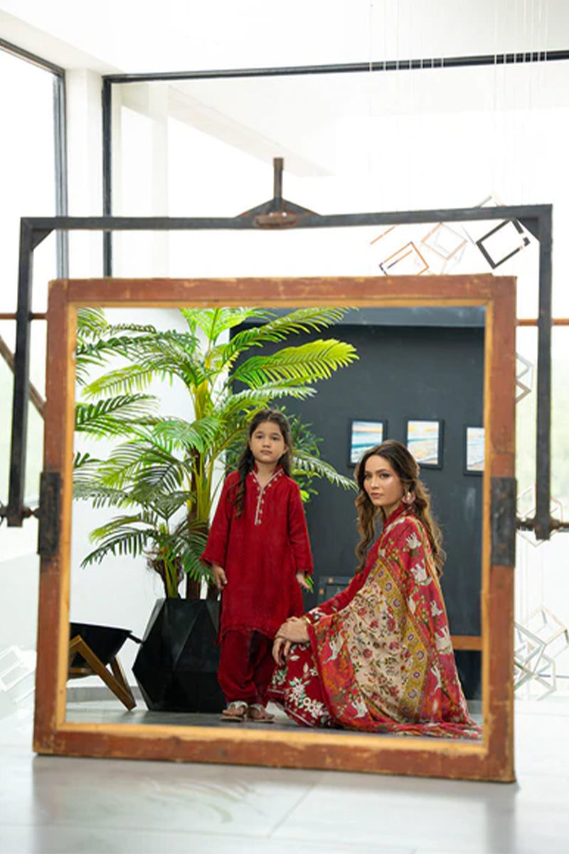 Twin with your little one this season in this deep red cherry kurta with minimal embroidery on neckline and lace detailings on sleeves,daman and neckline.skinny shalwar is on plain silk.Shirt: In-House Embossed SilkShalwar: In-House Embossed Silk