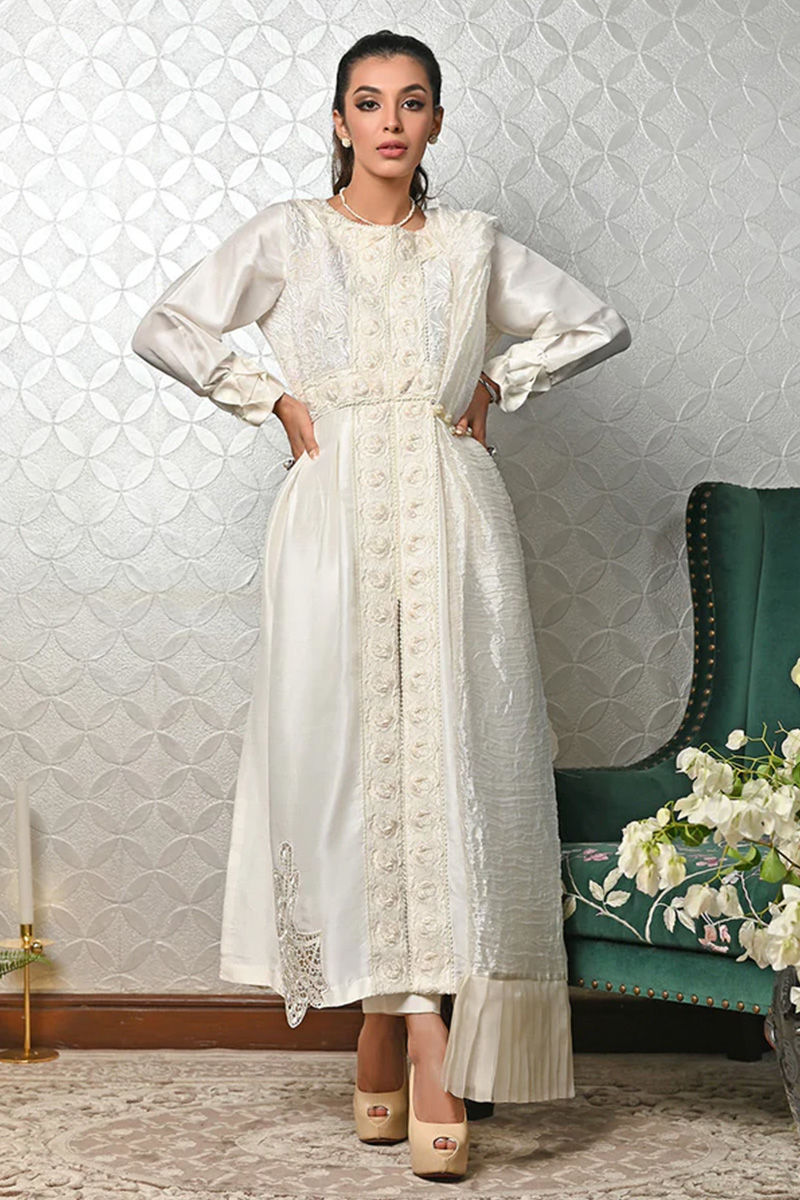 A classic white on white. Our love for whites is forever.Cut from plush silk with a modern front open silhouette. The bodice is fully embroidered and hand-worked. Statement pleated sleeves with edgy crushed dupatta are enough to turn heads around. You can dress this outfit up or down to make it fit for any occasion.Designers little secret tip, tie your hair in a classic bun or a pony to show off the statement back.Shirt: Raw SilkDupatta: Raw Silk