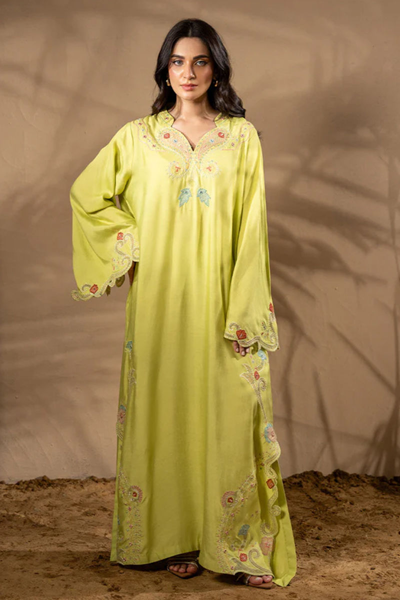 Breeze into elegance with bold florals and sunlit hues — this Khaddi Silk kaftan is a true statement of effortless luxury. Adorned with intricate embroidery and delicate appliqu florals, every detail is thoughtfully placed to enhance the kaftans fluid silhouette along with trumpet sleeves. The contrasting summer tones bring a refreshing vibrance, while the natural texture of Khaddi Silk offers breathable comfort with a touch of rustic charm. Graceful yet contemporary, this piece is perfect for daytime gatherings, resort wear, or any moment that calls for elevated ease.Shirt maximum length 53Model height 5'2