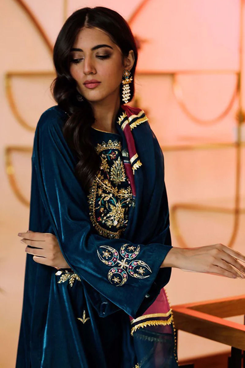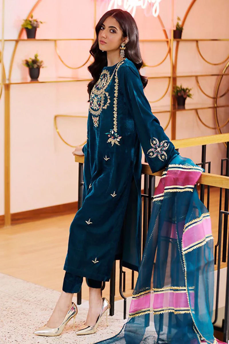 A plush velvet in deep turquoise shade perfect for any winter soirée! It is adorned with intricate gold handwork and silk thread in shades of deep turquoise magenta and plum. The organza statement dupatta in rich winter shades of plum and turquoise will definitely make you stand out.* Please note the price of the silk fabric option includes the complete outfit.