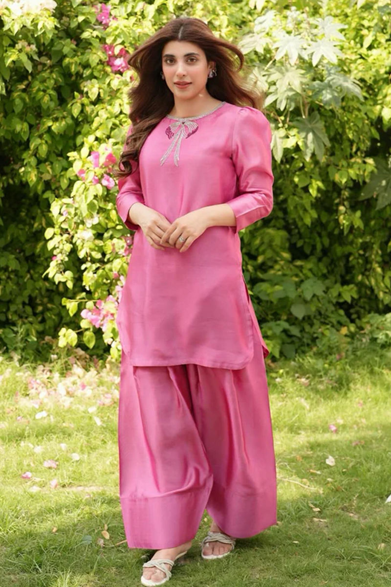 An elegant Sheesha silk shirt and shalwar set that exudes luxury and sophistication. The shirt is crafted from rich, lustrous Sheesha silk, offering a soft, fluid drape that catches the light with every movement. The neckline is adorned with intricate hand-embroidery, featuring delicate bow motifs that add a refined touch of charm and elegance. Paired with an organza duppata which is an add on. Maximum shirt length: 32" , Model height: 5'9