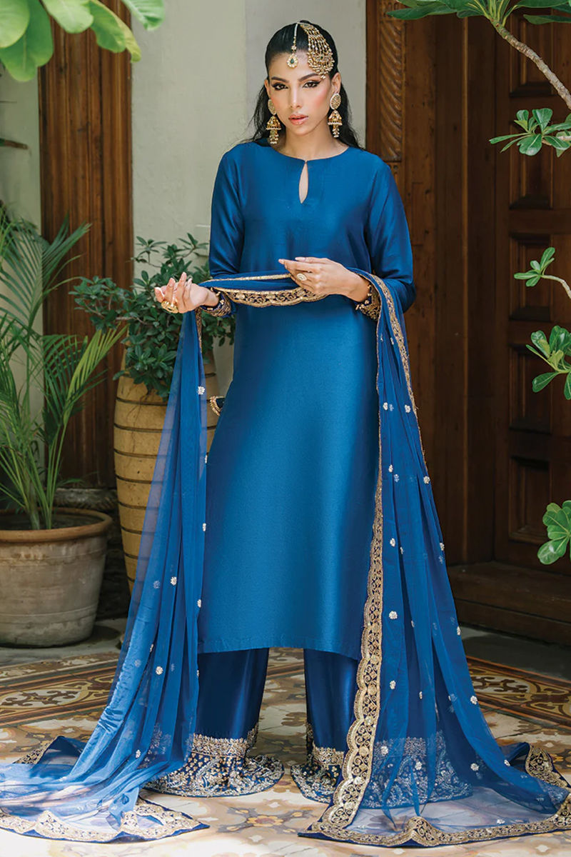 Vanya: This striking electric blue monochrome outfit features a straight-cut shirt crafted from luxurious pure raw silk. Paired with the shirt is a flared dhaka, designed to complement the shirt’s sleek lines with its voluminous, flowing silhouette. The dhaka is heavily hand-embroidered, The elaborate detailing, including dabka, kora, sitara, and zardozi, creates a harmonious and cohesive look. The dupatta is crafted from delicate net fabric, It features hand-embroidered botis (small motifs) and an intricately designed border that mirrors the embroidery techniques found on the shirt and dhaka. Styling Tip: Achieve a Regal Monochrome Look with Elegant Accents: Style your hair in soft waves or an elegant updo to keep the focus on the outfit’s detailing. Select elegant heels or sandals in a matching electric blue or a neutral shade that complements the outfit. Shirt: Pure raw silk Dupatta: Net Izaar: Pure raw silk