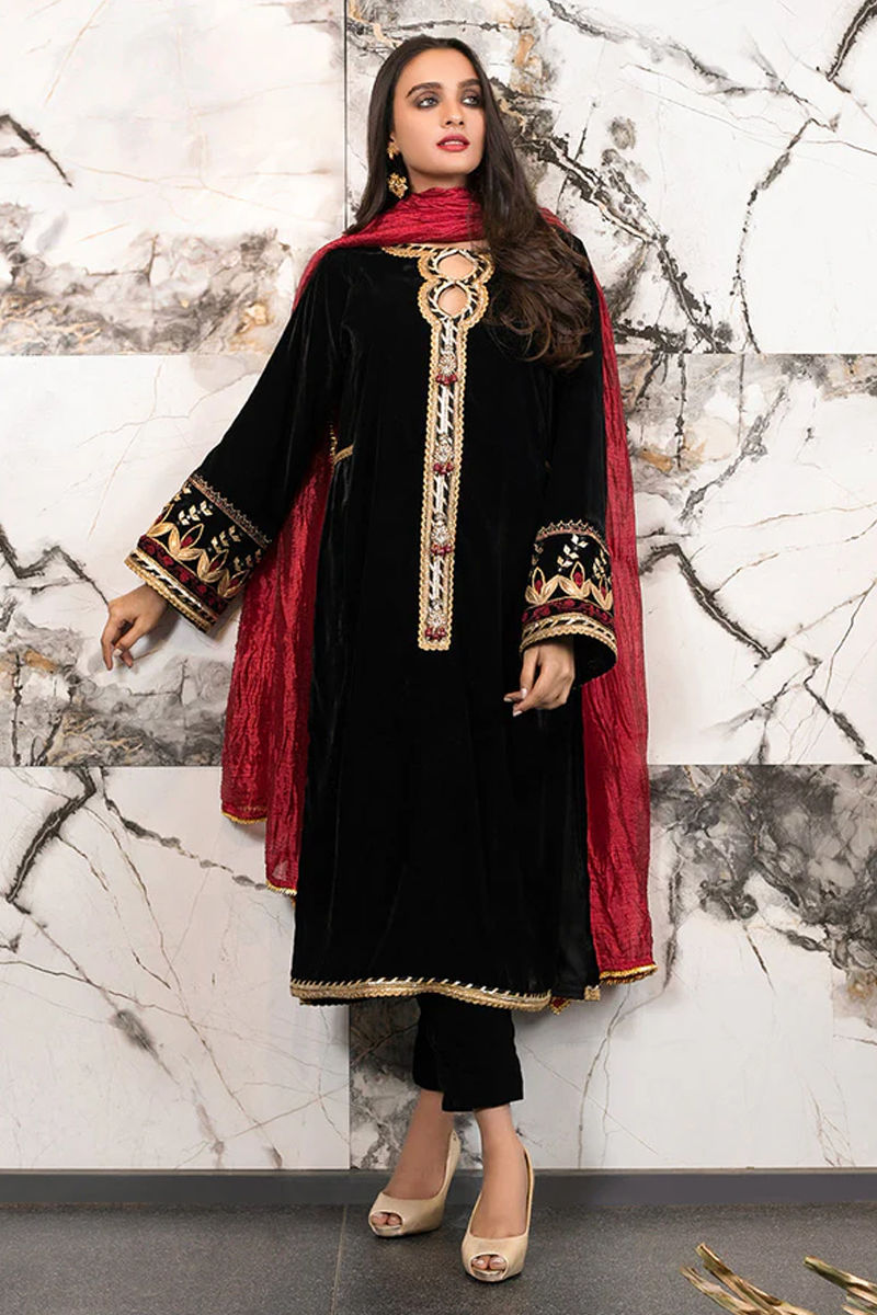 This black round neck velvet kurta with hand worked buttons on the neckline and lace finishing is a must have for the festive seasons. The sleeves have floral embroideries on cuff. The look is complemented with black velvet straight pants and red crushed dupatta with kingri gota finishing.Shirt: VelvetDupatta: Velvet