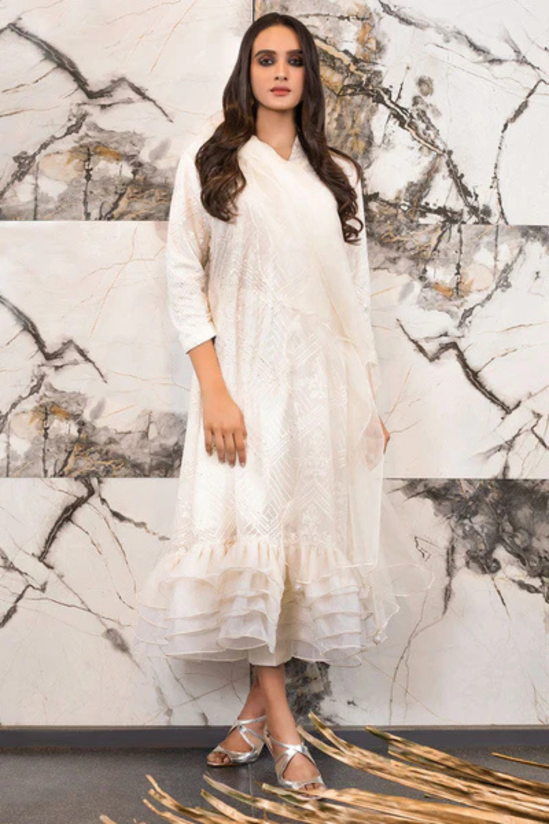 White embroidered flared peshwas with wide net frills border and embellished back with hand worked bird motif. It is paired with organza dupatta with tassels on four sides.