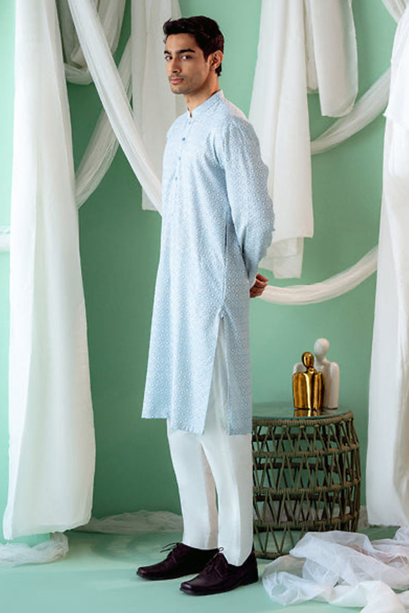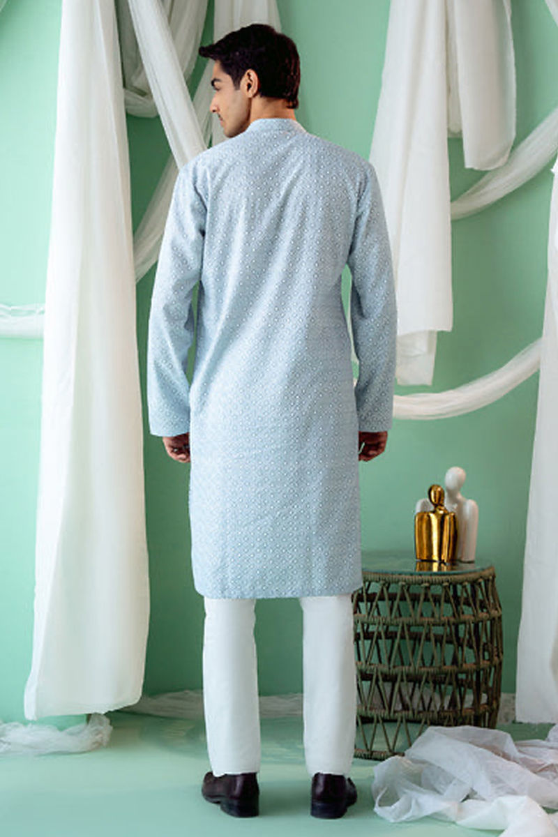 A stylish men's Schiffli long cut loose kurta crafted from lightweight, breathable fabric, featuring intricate embroidered patterns along the collar and sleeves, adding a touch of traditional elegance. The kurta's relaxed, loose fit ensures comfort while maintaining a modern aesthetic, making it perfect for casual or semi-formal occasions. Paired with smart, straight-cut cotton pants that offer a sharp, clean silhouette, this ensemble strikes the perfect balance between tradition and contemporary fashion. Maximum Shirt length: 42" Model Height : 5'11