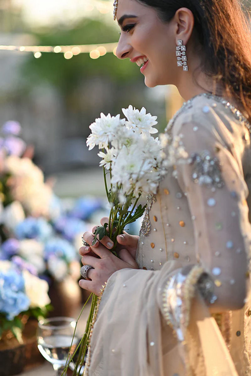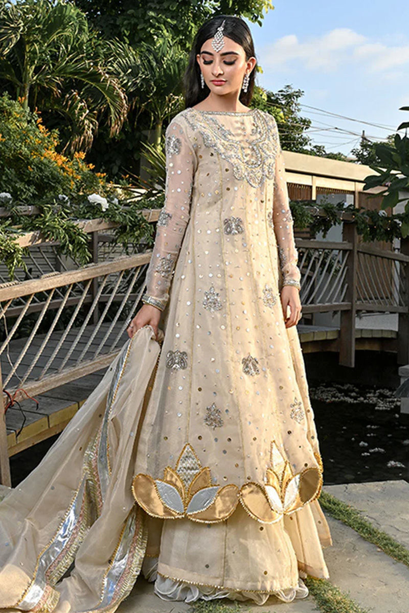 Beautiful Ivory kalidar with signature boat neckline in mirror and zardozi work. A spray of gold and silver sitara and zardozi booties all over the peshwas makes it perfect for this wedding season. The daman is beautifully appliqued in our signature floral motifs. It is complemented with silk pants and tissue dupatta finished with gota and kiran laces and spray of gold silver sitara. Shirt: Silk Dupatta: Silk Pant: Silk