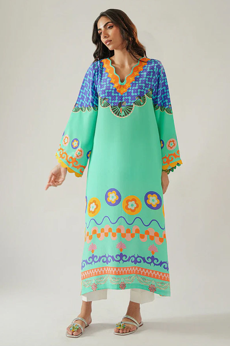 Play with colors this Eid! This stunning turquoise blue pure crepe kurta boasts a striking color-blocked design, blending floral and geometric patterns for a contemporary, chic look. The floral motifs bring a touch of femininity, with delicate blooms in soft pastel shades, while the geometric patterns provide a modern, edgy flair. It's versatile enough for both casual and semi-formal occasions, exuding modern elegance with a hint of artistic flair. Silk pants are an add on. Model height 5'10, maximum shirt length 51" Shirt: Crepe Dupatta: Chiffon Pant: Pure Rawsilk