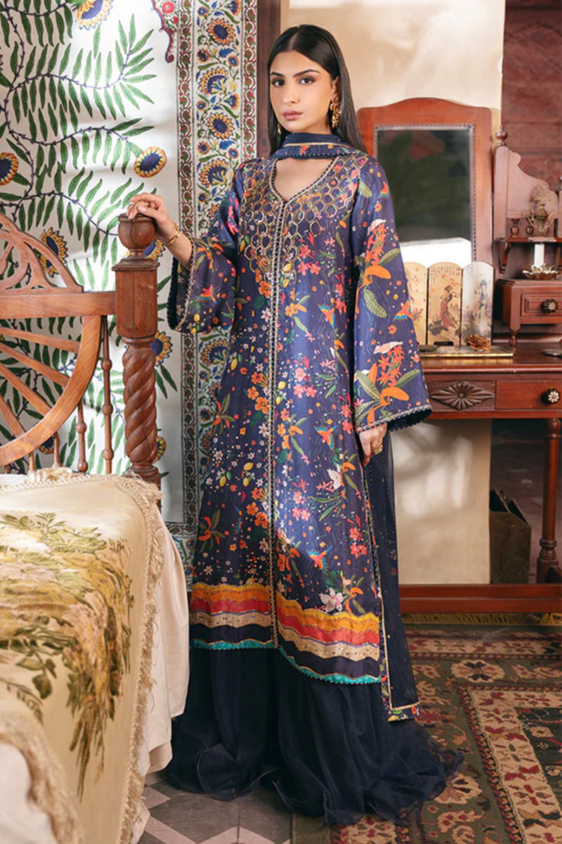 Blue is the new classic, and we’re here for it! This breathtaking tropical print outfit is a true showstopper, adorned with intricate handwork of sequins, stones, and moti. The delicate embellishments on the neckline, sleeves and hemline makes it the perfect choice for grand occasions. The look is completed with a sheer net dupatta, carefully finished to add a touch of ethereal charm. Pair it with a net lehenga, exuding grace. Style it with statement jewelry and heels to create a timelessly elegant look that’s bound to turn heads at any celebration!