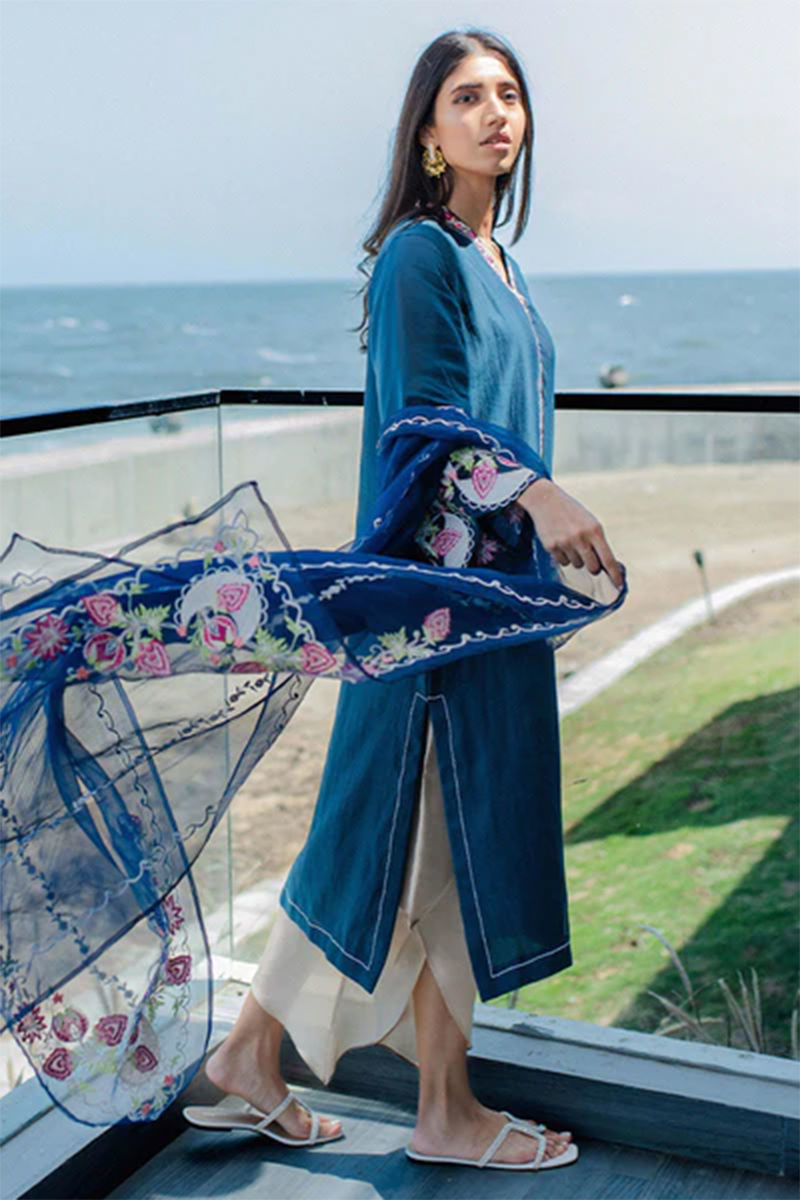 Minimalism and subtlety this season in this baggy silhouette. A cobalt blue Kora cotton shirt with vibrant and subtle embroidery shades. Embroidery on an overlapping neckline cut out embroidered sleeves with embroidery and stitch detailed side skits and daaman. Pure raw silk flowy precisely cut wide pants and a fully embroidered organza dupatta is a vibe. This outfit comes along with the shirt and pantsShirt: CottonDupatta: Cotton