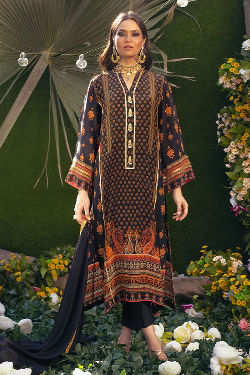 We Designed this classic black print keeping in mind that it should be seasons Must Have! printed on pure crepe silk in traditional motifs and paisleys with a pop of rusts , reds and neutrals. We love the long relaxed silhouette of this kurta. It has signature Amna Arshad handwork details in zardozi on neckline. Tissue silk dupatta with finishings on all 4 sides. Pure silk shirt, tissue silk dupatta and add on pure Raw silk pants.Shirt: Pure Crepe SilkDupatta: Tissue Silk