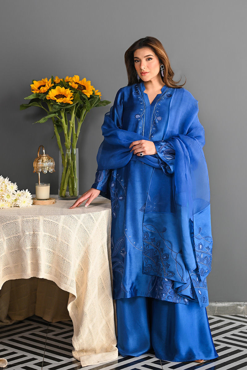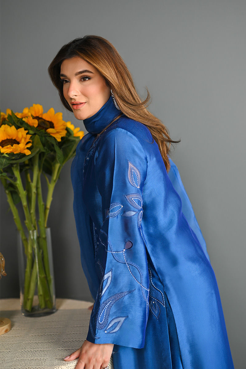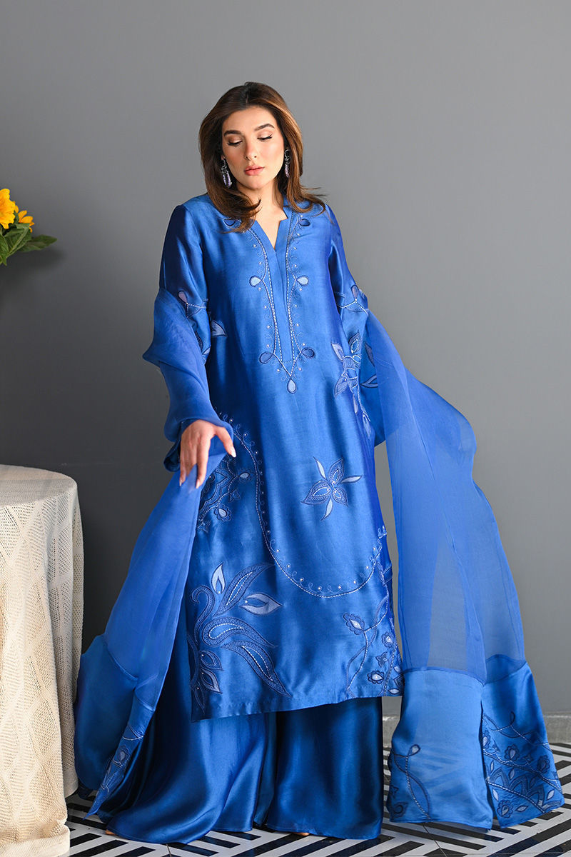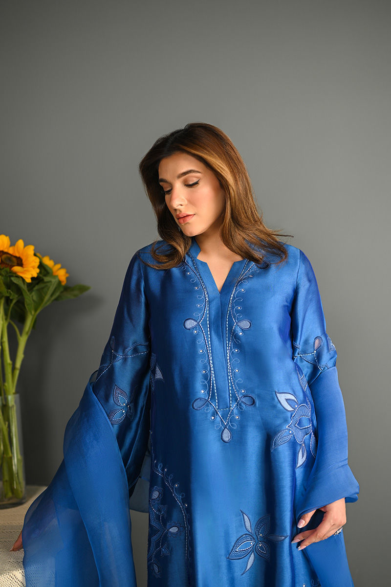 This vibrant electric blue sheesha silk outfit is a stunning masterpiece, featuring intricate floral motifs embroidered with precision. The floral designs are enhanced using delicate applique techniques with organza, creating a layered, textured effect that adds depth and dimension to the piece. Paired with this outfit is an ethereal organza dupatta, where applique floral motifs adorn the edges, complementing the design of the shirt. For an added layer of sophistication, a matching sheesha silk dhaka is an add on. This ensemble is perfect for anyone seeking a bold yet graceful statement for a special occasion. Shirt maximum length 48 Model height 5'5