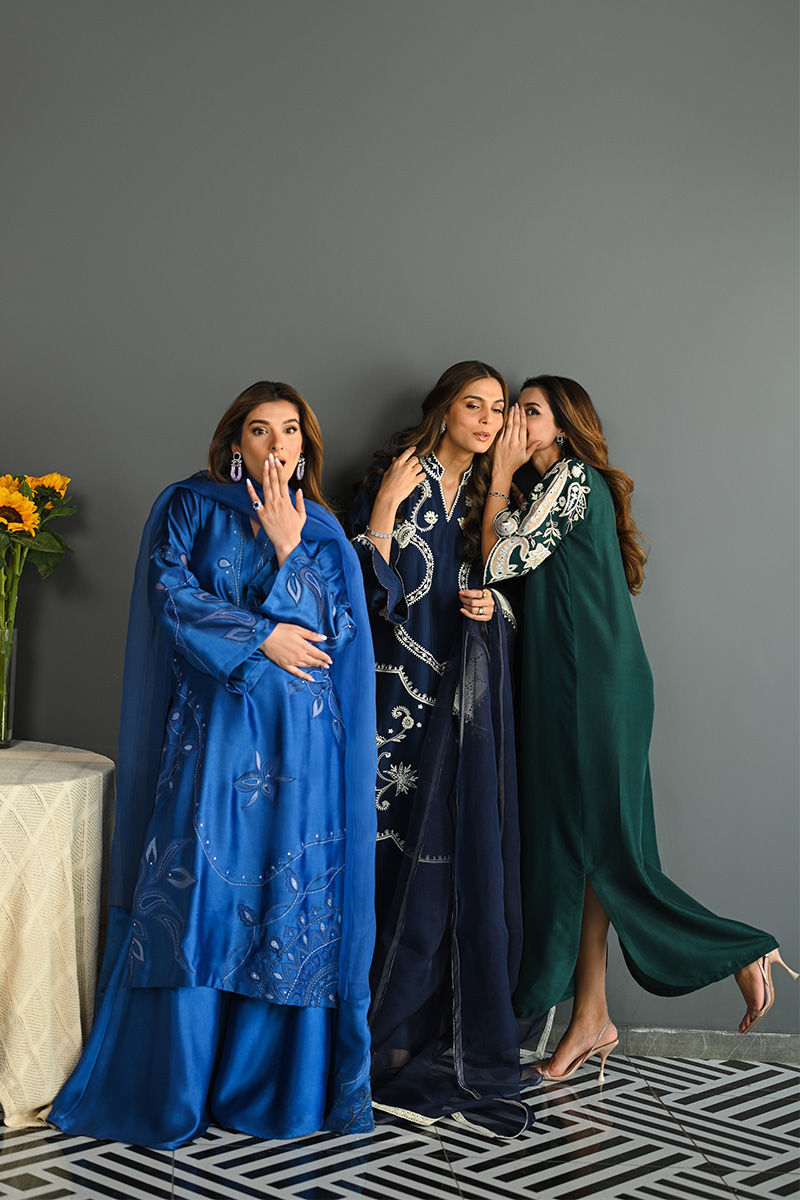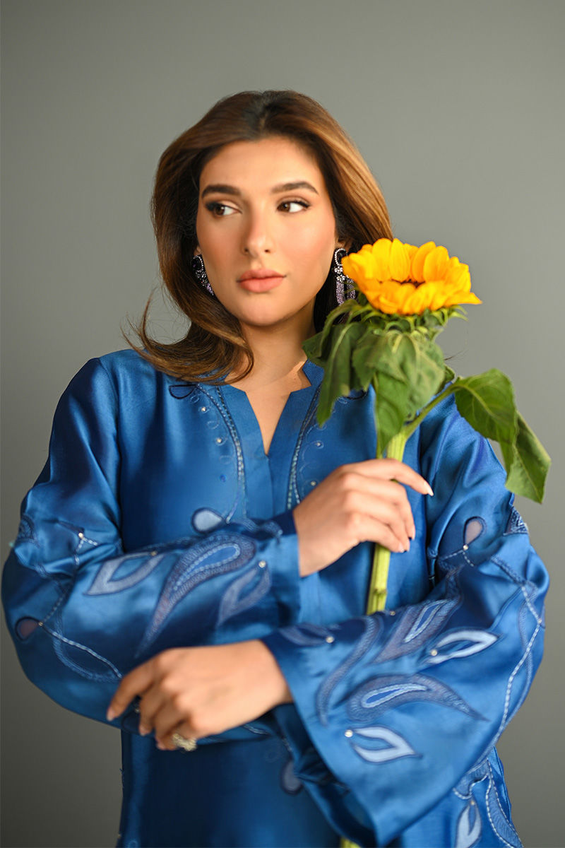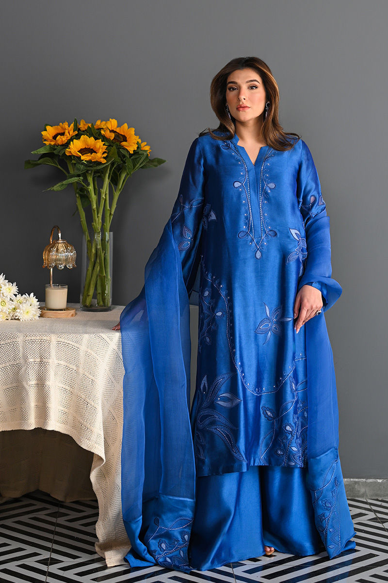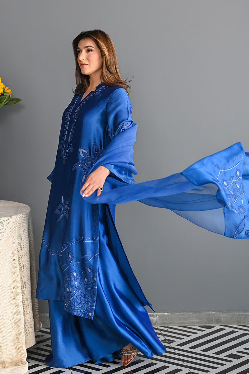 This vibrant electric blue sheesha silk outfit is a stunning masterpiece, featuring intricate floral motifs embroidered with precision. The floral designs are enhanced using delicate applique techniques with organza, creating a layered, textured effect that adds depth and dimension to the piece. Paired with this outfit is an ethereal organza dupatta, where applique floral motifs adorn the edges, complementing the design of the shirt. For an added layer of sophistication, a matching sheesha silk dhaka is an add on. This ensemble is perfect for anyone seeking a bold yet graceful statement for a special occasion. Shirt maximum length 48 Model height 5'5