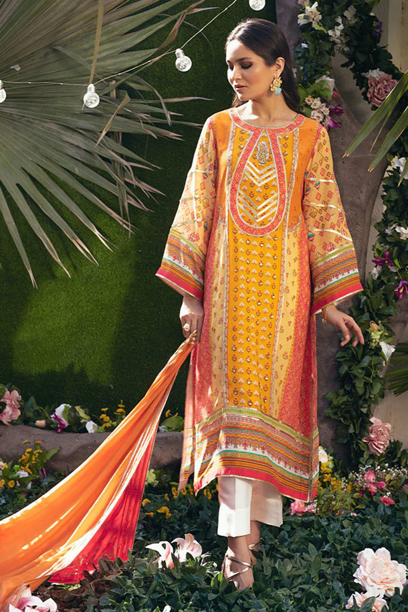 Created in the house at the Amna Arshad Design House. A straight relaxed silhouette fit for all occasions with a burst of colors and prints making it a festive must-have! Wear it on Iftar Eid or Mayuns it's a versatile outfit very close to our hearts. Printed on pure crepe silk to give you that luxurious feel. Dupatta is two-toned tissue silk with signature gotta detailing. The shirt has multiple handworks and gotta detailingShirt: Pure Crepe SilkDupatta: Pure Crepe Silk