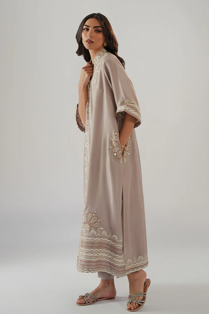 We know our AARI game!! Radiate timeless sophistication with this beige raw silk kurta, delicately embellished with intricate aari embroidery. The fine, lustrous fabric adds a subtle sheen, while the beautiful, handcrafted embroidery in rich threadwork creates a stunning visual effect along the neckline and hemline. The kurta’s elegant straight cut offers a flattering silhouette, perfect for both formal and festive occasions. Paired with matching straight pants, this ensemble exudes refined grace and effortless style. Whether for a special celebration or an upscale gathering, this ensemble is the epitome of luxury and tradition. Model height 5'10. Maximum shirt length 50"