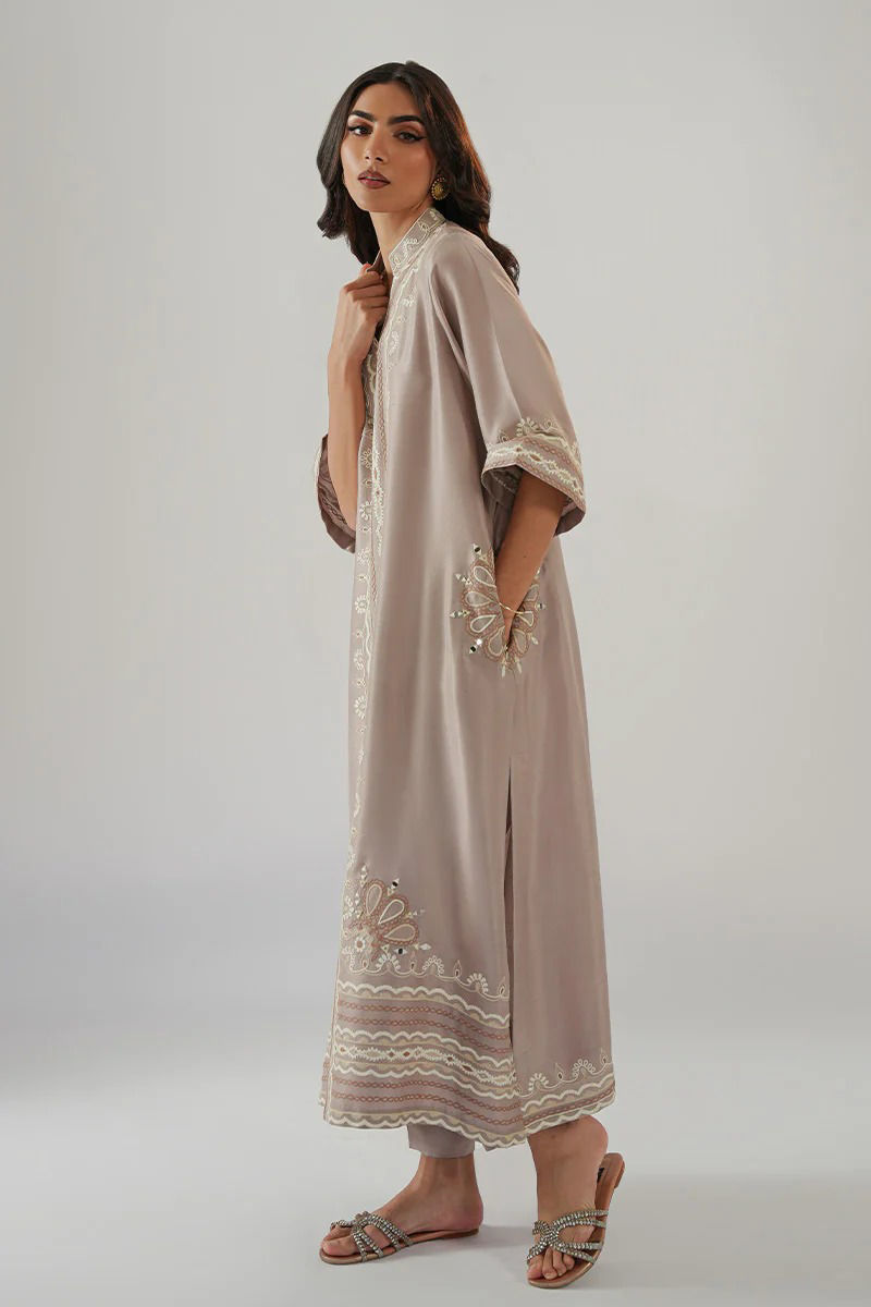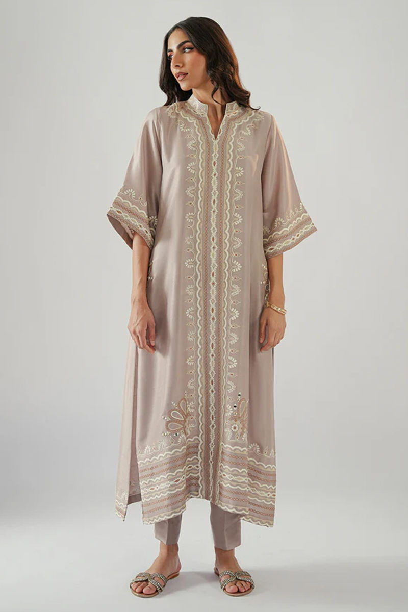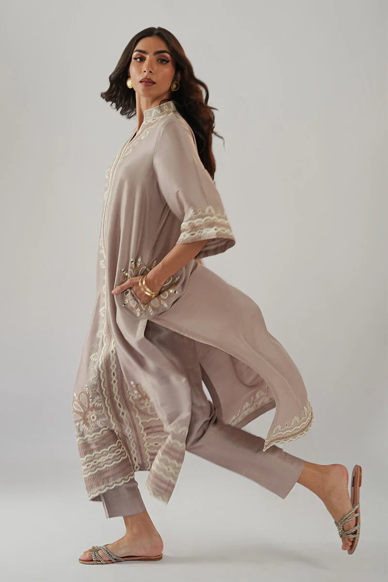 We know our AARI game!! Radiate timeless sophistication with this beige raw silk kurta, delicately embellished with intricate aari embroidery. The fine, lustrous fabric adds a subtle sheen, while the beautiful, handcrafted embroidery in rich threadwork creates a stunning visual effect along the neckline and hemline. The kurta’s elegant straight cut offers a flattering silhouette, perfect for both formal and festive occasions. Paired with matching straight pants, this ensemble exudes refined grace and effortless style. Whether for a special celebration or an upscale gathering, this ensemble is the epitome of luxury and tradition. Model height 5'10. Maximum shirt length 50" Shirt: Pure Rawsilk Pant: Pure Rawsilk